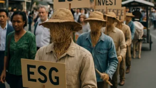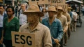 都心の主要道路で、朝から異常な光景が目撃された。畑を抜け出した1000体もの自走型カカシが、竹馬に乗って一糸乱れぬ縦列行進を開始、人類の環境意識に一石を投じるべく、環境リーダーらに囲まれて“ESG投資を考え直せ!”のプラカードを掲げたパレードが行われた。