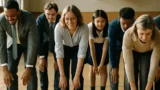 オフィスのデスク上でサボテンが爆発し、驚いた表情の社員たちがその様子を見ている現実的な一瞬の写真。 人材育成
